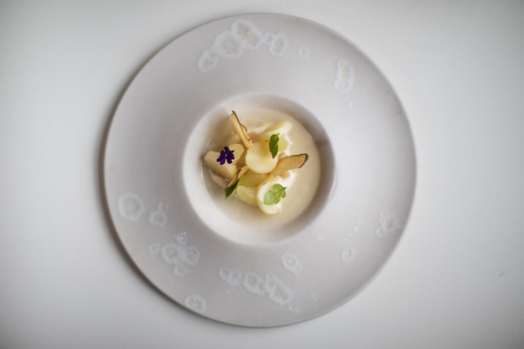 Caroline y Nicolas trabajan con 24 microestaciones, ingredientes hiperlocales, agricultura regenerativa y una sensibilidad artística que admiramos profundamente. Su cocina es una expresión de respeto a la tierra, un lenguaje que transforma hierbas, frutas, flores, raíces y plantas silvestres en arte comestible.